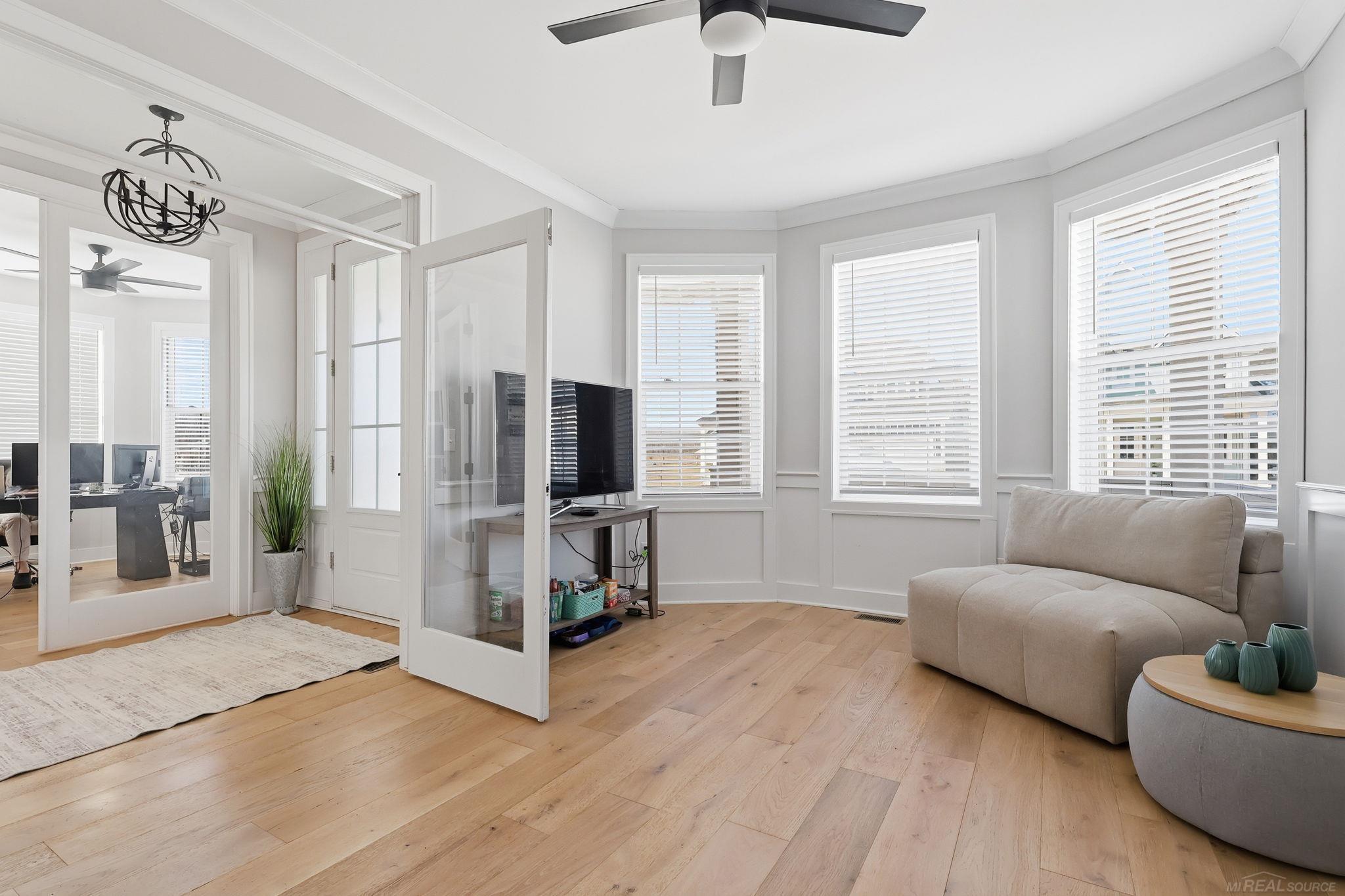 Newer construction with a layout designed for modern living, located just steps from Macomb Corners Park and minutes from the Macomb Township Recreation Center. A large covered front porch creates a welcoming entry and adds to the home’s traditional curb appeal. Inside, the kitchen is the centerpiece—finished with quartz countertops, stainless steel appliances, tile backsplash, and a layout that opens directly to the great room and breakfast nook, making it ideal for entertaining and everyday living. Wainscoting and hardwood flooring add detail throughout the main living space, while a covered lanai with ceiling fan overlooks the fenced backyard. The first-floor primary suite features two walk-in closets and a private bath with soaking tub and tiled shower. The main level also includes a den with European French doors and ceiling fan, powder room, laundry, and mudroom area. The dining room has been converted into a main-floor bedroom (no closet), offering flexibility for guests or office space. Upstairs you’ll find a loft, four additional bedrooms—three with walk-in closets—along with a Jack and Jill bath and an additional full bath. The basement is plumbed for a future bathroom and ready for finishing. With a park directly across the street and easy access to Macomb Township amenities, this home offers space, flexibility, and a location that’s hard to beat.