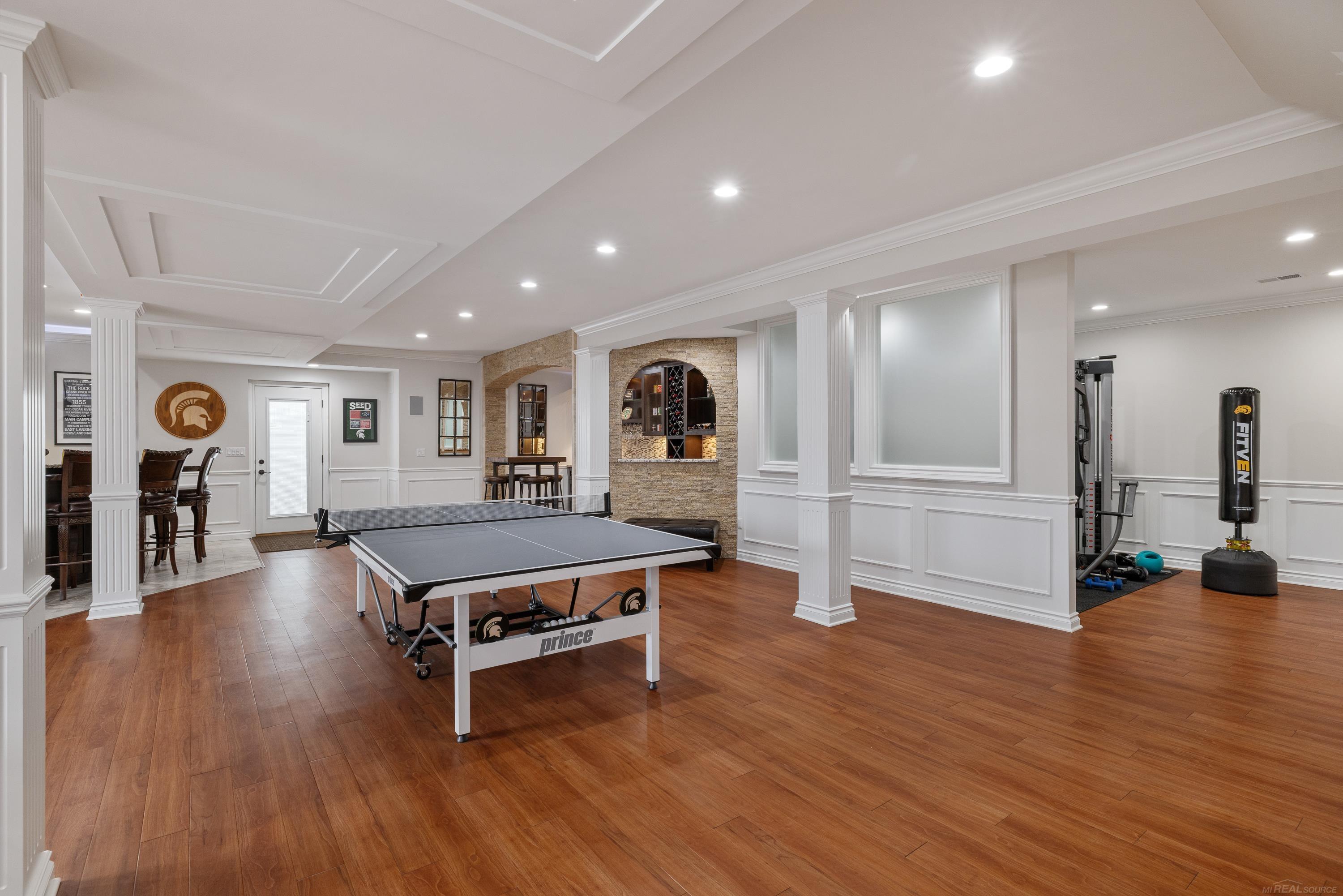 Nestled within the prestigious Creekside Village Subdivision, this four-bedroom executive split-level residence stands as a masterclass in architectural sophistication and superior craftsmanship. From the moment you arrive, the striking brick-and-stone façade—accentuated by grand arched windows and meticulous masonry—signals a home of rare distinction, where every detail has been thoughtfully curated. The interior is defined by an expansive great room featuring soaring cathedral ceilings and intricate custom millwork, including classic wainscoting that complements the rich hardwood floors flowing throughout the main living areas. Culinary enthusiasts will gravitate toward the stunning designer kitchen, a triumph of form and function boasting sleek dark cabinetry, premium granite and quartz countertops, and a massive waterfall-edge center island. For the ultimate retreat, the first-floor primary suite offers a secluded sanctuary with an elegant tray ceiling, a palatial walk-in closet, and a spa-like bath equipped with a massive frameless glass shower and soaking tub. The upper level continues the theme of scale with three generously sized bedrooms, but the true piece de resistance is the expansive finished walkout basement, designed for high-end entertaining and multifaceted living; this impressive lower level features a professional-grade wet bar with custom stonework and backlighting, a dedicated workout studio, a vast entertainment zone perfect for theater or gaming, and a full luxury bath. The transition from the walkout to the exterior reveals a stunning tiered paver patio with a built-in fire pit, providing an unparalleled backdrop for indoor-outdoor hosting and completing a home where luxury is a standard visible in every arch, trim, and finish. This is more than just a home; it is a definitive statement of luxury, offering an unparalleled living experience for those who demand nothing less than perfection.